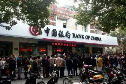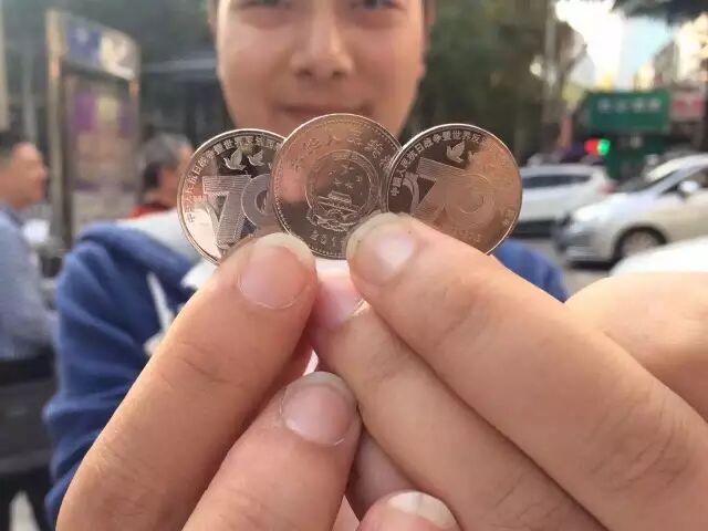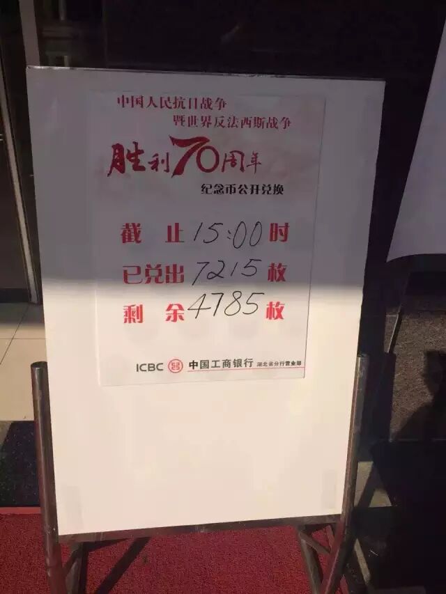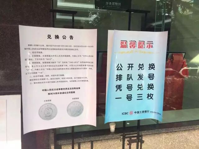 “中國人民抗日戰爭暨世界反法西斯戰爭勝利70周年”普通材質紀念幣”今天(12號) 開始兌換!今天一大早,銀行門口都是這樣的。